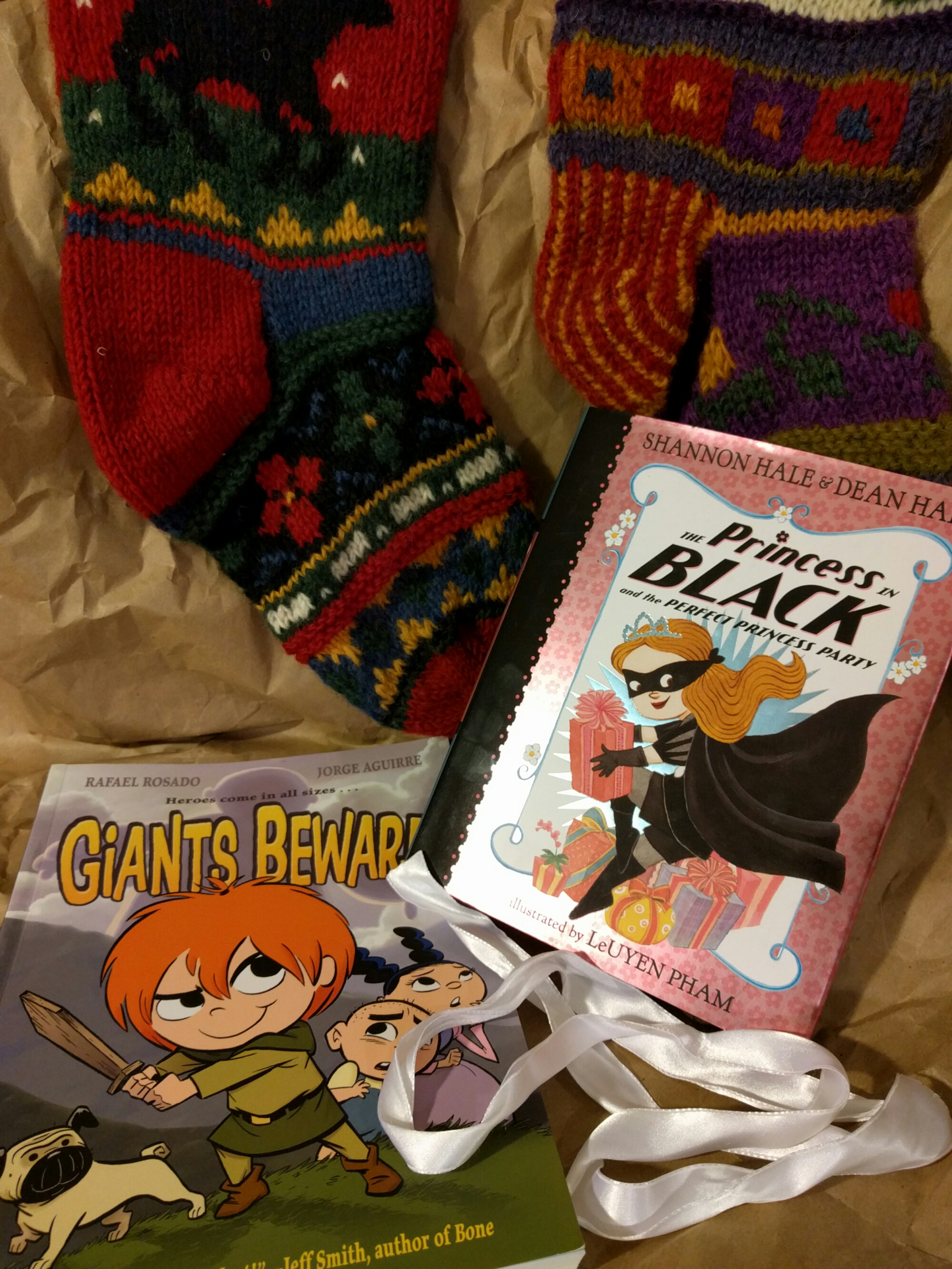 The theme for day seven of #ABookishHoliday is “books & socks.” I’m not really a “socks” person, so I struggled a bit with this assignment until I realized that stockings are basically socks. So, tonight’s picture is of our Christmas stockings, and the books I picked out to give my niece and nephew as part of their Christmas present this year. (They’re too young to read this blog, so I’m pretty sure I won’t be giving away any secrets by sharing this with you.)