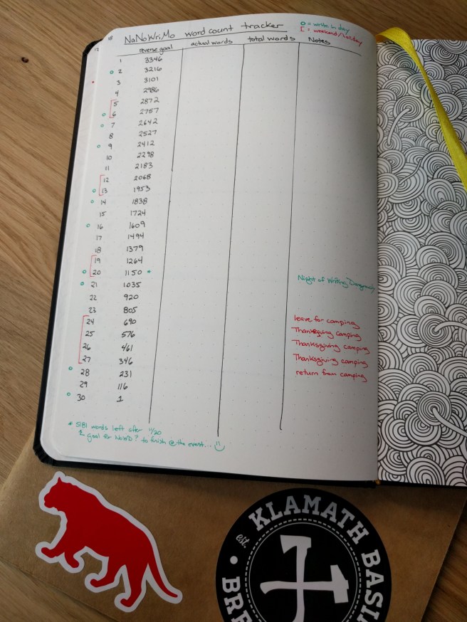 The idea is to capitalize on initial early excitement and momentum and get ahead of your word count early. I really like this idea for a number of reasons. So, I created a word count tracker in my notebook, and I’m going to give it a try. If all goes well, I might even be done with my 50k words before the Thanksgiving holiday! Another added bonus is that, if I stick to this plan and meet these word count goals, I might have a real shot at ringing that bell at the Night of Writing Dangerously.