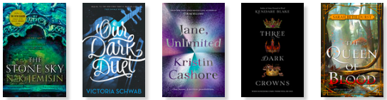 The first two (The Stone Sky and Our Dark Duet) were pre-orders that have been sitting on my Kindle, waiting for me to get around to reading them, but they’re both the last in their series, and I’m not really ready for those series to end. The middle one (Jane, Unlimited) is on hold for me at the library, but I put a temporary freeze on it because I didn’t think I’d have time to read it in November. The last two (Three Dark Crowns and The Queen of Blood) have been on my Kindle since nearly their publication dates, and now they both have sequels out this year. All of them sound like I will LOVE them and devour them.
