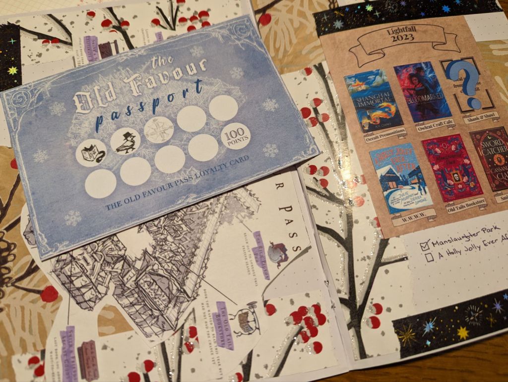 I decided to do a little doodling on my Old Favour Passport. I’m creating a different doodle for each shop with the intention of making them look sort of like stamps. The first one I did was a little cat reading a book for Old Tails Bookstore. Then I realized that, with all the visiting I did last weekend, I think I can officially check off the only non-reading prompt (reach out to someone during this festive season). That is for the Rich Pigeon Pub, so I added a pigeon with a top hat doodle in the next circle. (The Pub counts for the loyalty card, right?)