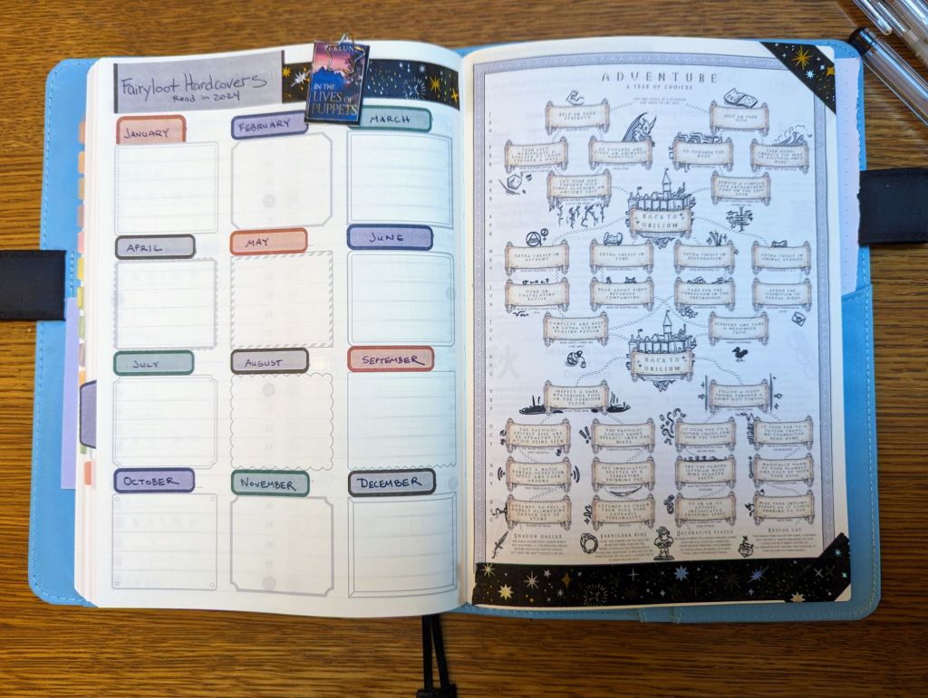 I labeled both with the months of the year before I decided that I wasn’t going to try force myself to do one a month. I’ll probably end up covering over those labels with the printout of the book cover for the book I read. You might also have noticed the printout of this year’s Adventure in Aeldia prompts next to the Fairyloot hardcover tracker page. I’m planning on participating again this year, but I’m NOT planning on giving myself the additional requirement of having to read a Fairyloot hardcover in order to fulfill the prompt.